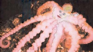 Wtem poczuł się unieruchomiony. Nie zwrócił początkowo uwagi, zamroczony namiętnością, gdy wkrótce poczuł straszny ból i coś zaparło mu oddech. Jego przerażonym oczom ukazało się coś bezkształtnego, śliska i chłodna masa kłębiła się pod nim, a potworne niezliczone macki okręcały go i dusiły, ssały soki i życie…