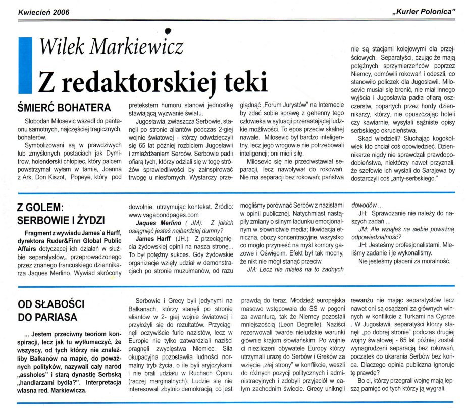 Komentarz do tekstu ponizej”Serbowie i Zydzi:” Antyserbscy politycy przechytrzyli zydowska opinie publiczna w New Yorku. Moim zyczeniem jest by new – yorski “establishment” znalazl droge do naprawienia wielkiej krzywdy wyrzadzonej Serbom.WM